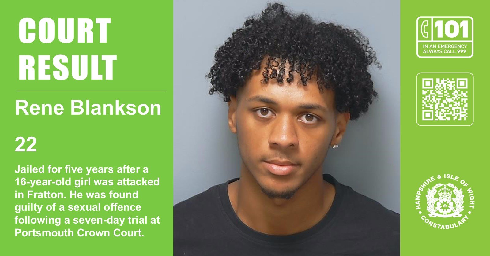 On Thursday 1 May 2025 Blankson was found guilty of assaulting a female aged thirteen or over by penetration with a part of the body by a jury at Portsmouth Crown Court. He was sentenced at the same court on Thursday 14 August to five years in prison, an additional three year extended license period, and is subject to a restraining order for life.
